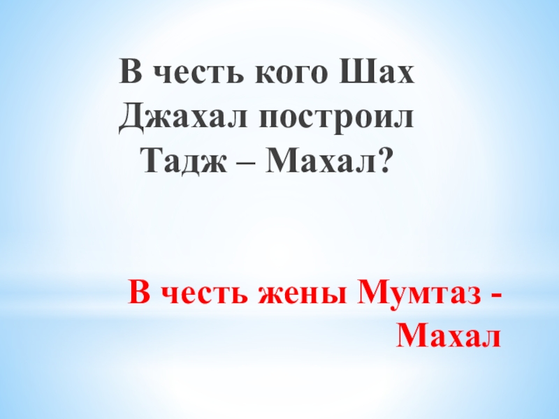 В честь жены Мумтаз - МахалВ честь кого Шах Джахал построил Тадж – Махал?