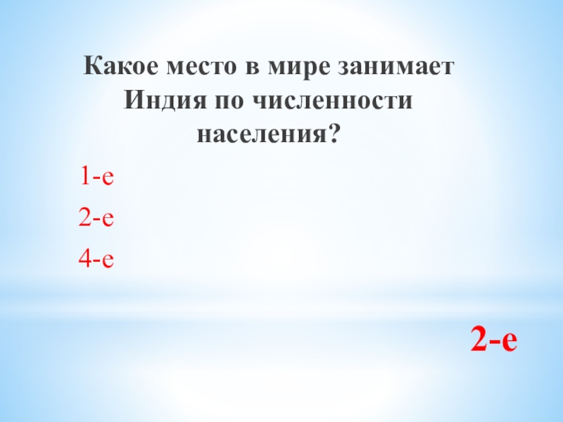2-е Какое место в мире занимает Индия по численности населения?1-е2-е4-е