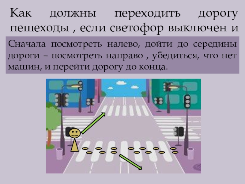 Сначала посмотреть налево, дойти до середины дороги – посмотреть направо , убедиться, что нет машин, и перейти дорогу до конца.