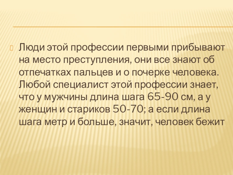 об отпечатках пальцев и о почерке человека. Любой специалист этой профессии знает, что у мужчины длина шага 65-90 см, а у женщин и стариков 50-70; а если длина шага метр и больше, значит, человек бежит