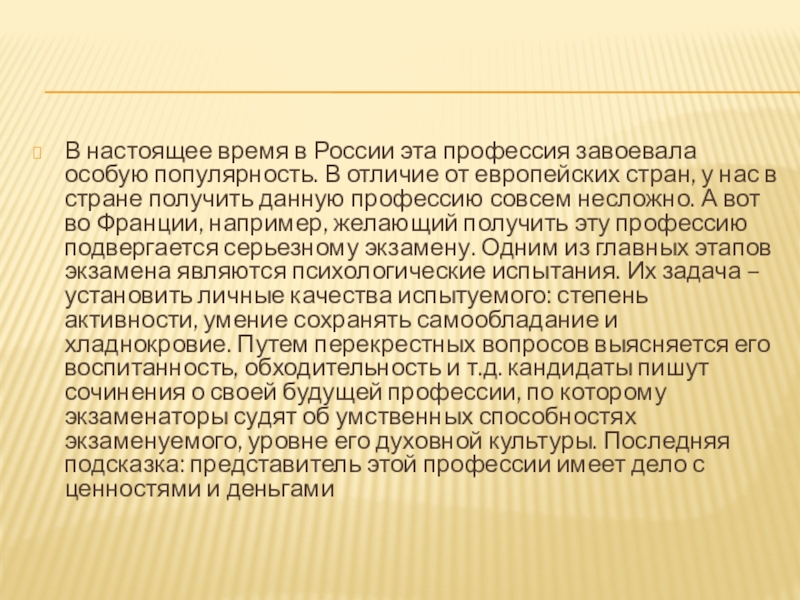 отличие от европейских стран, у нас в стране получить данную профессию совсем несложно. А вот во Франции, например, желающий получить эту профессию подвергается серьезному экзамену. Одним из главных этапов экзамена являются психологические испытания. Их задача – установить личные качества испытуемого: степень активности, умение сохранять самообладание и хладнокровие. Путем перекрестных вопросов выясняется его воспитанность, обходительность и т.д. кандидаты пишут сочинения о своей будущей профессии, по которому экзаменаторы судят об умственных способностях экзаменуемого, уровне его духовной культуры. Последняя подсказка: представитель этой профессии имеет дело с ценностями и деньгами