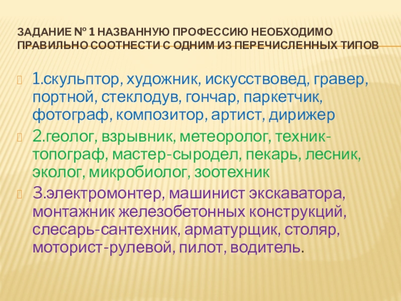 Слайд 4Задание № 1 названную профессию необходимо правильно соотнести с одним из