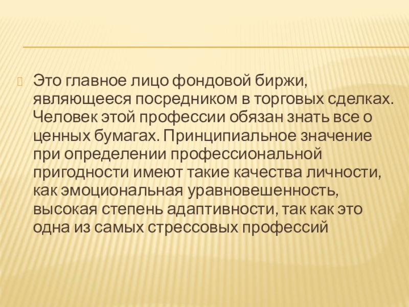 этой профессии обязан знать все о ценных бумагах. Принципиальное значение при определении профессиональной пригодности имеют такие качества личности, как эмоциональная уравновешенность, высокая степень адаптивности, так как это одна из самых стрессовых профессий