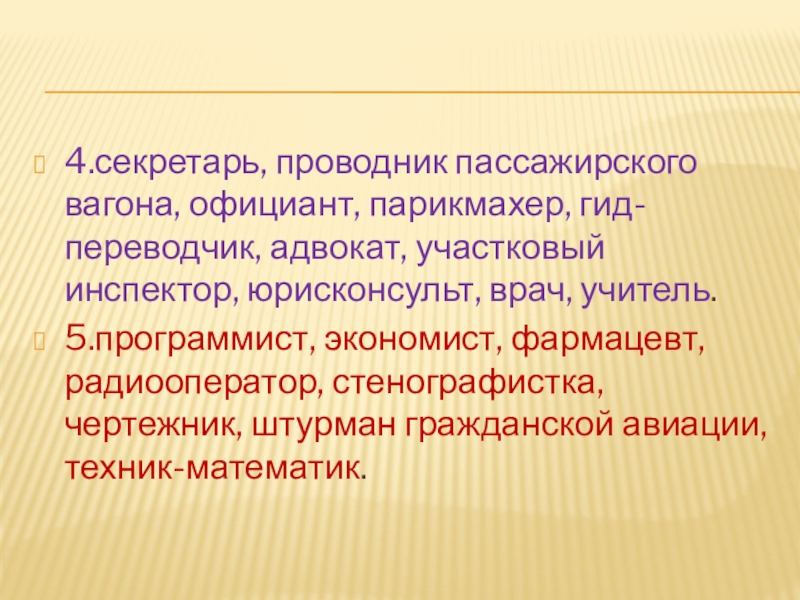 Слайд 54.секретарь, проводник пассажирского вагона, официант, парикмахер, гид-переводчик, адвокат, участковый инспектор, юрисконсульт,