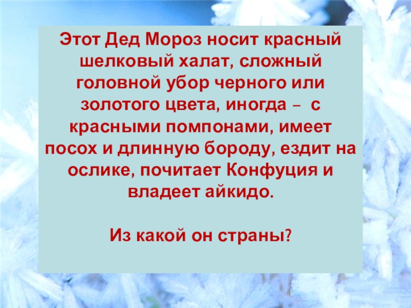 Слайд 7Этот Дед Мороз носит красный шелковый халат, сложный головной убор черного