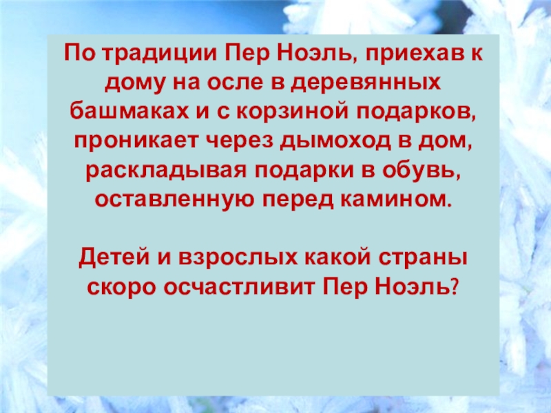 Слайд 9По традиции Пер Ноэль, приехав к дому на осле в деревянных