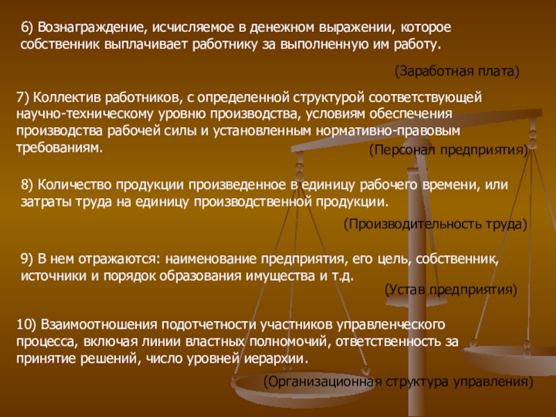 7) Коллектив работников, с определенной структурой соответствующей научно-техническому уровню производства, условиям обеспечения производства рабочей силы и установленным нормативно-правовым требованиям.