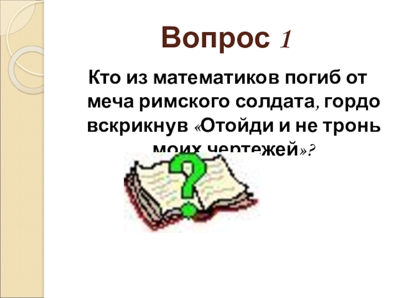 Вопрос 1Кто из математиков погиб от меча римского солдата, гордо вскрикнув «Отойди и не тронь моих чертежей»?