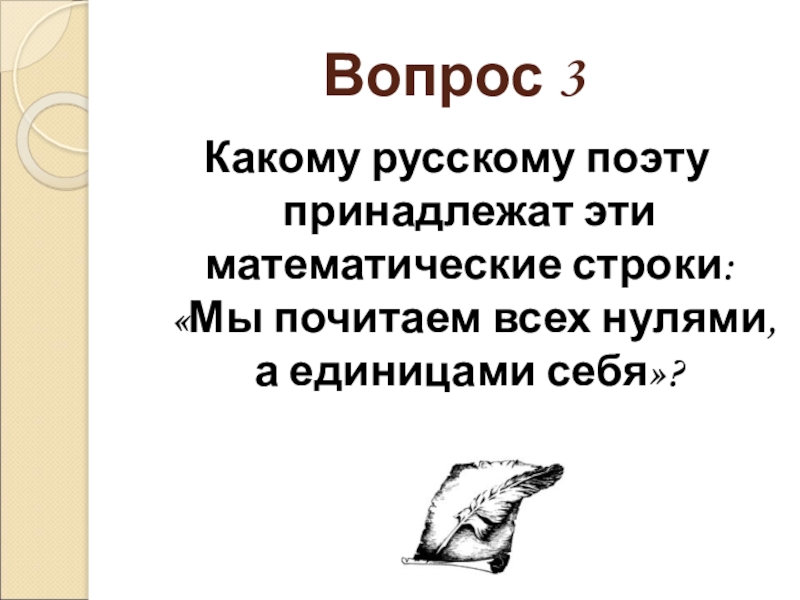 Вопрос 3Какому русскому поэту принадлежат эти математические строки: «Мы почитаем всех нулями, а единицами себя»?