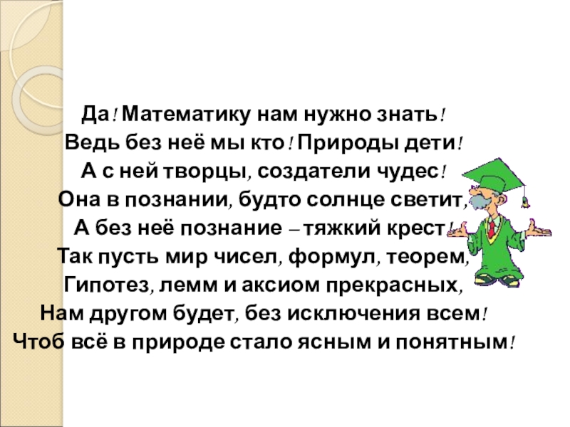 Да! Математику нам нужно знать!Ведь без неё мы кто! Природы дети!А с ней творцы, создатели чудес!Она в