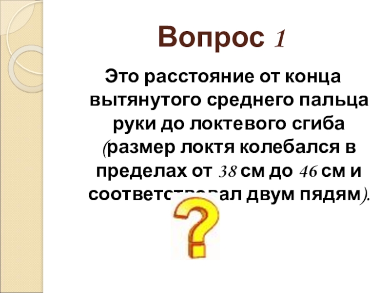 Вопрос 1Это расстояние от конца вытянутого среднего пальца руки до локтевого сгиба (размер локтя колебался в пределах