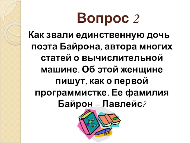 Вопрос 2Как звали единственную дочь поэта Байрона, автора многих статей о вычислительной машине. Об этой женщине пишут,