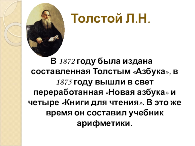 Толстой Л.Н. В 1872 году была издана составленная Толстым «Азбука», в 1875 году вышли в свет переработанная