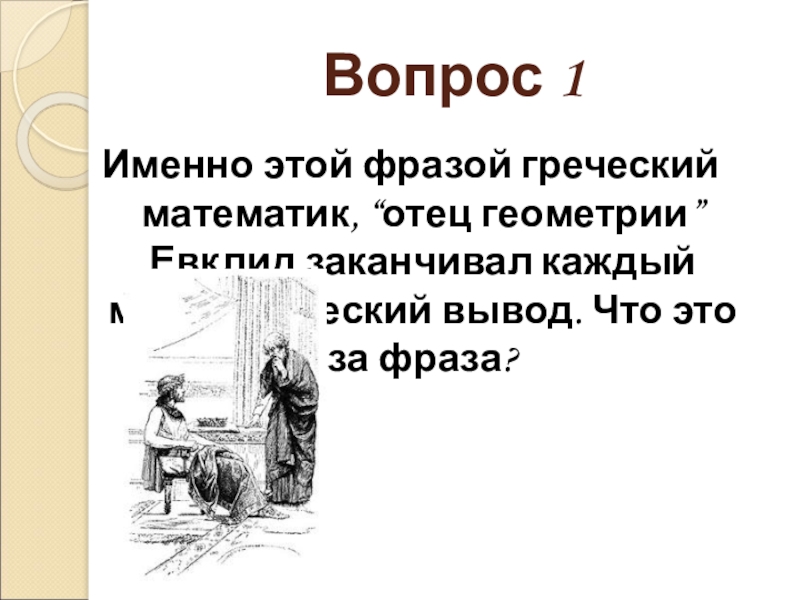 Вопрос 1Именно этой фразой греческий математик, “отец геометрии” Евклид заканчивал каждый математический вывод. Что это за фраза?