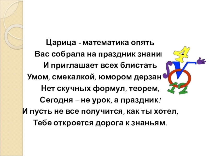 Царица - математика опятьВас собрала на праздник знанийИ приглашает всех блистатьУмом, смекалкой, юмором дерзаний.Нет скучных формул, теорем, Сегодня – не урок, а праздник!И пусть не все получится, как ты хотел,Тебе откроется дорога к знаньям.
