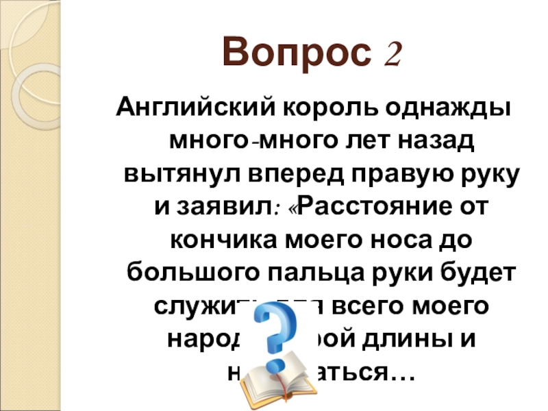 Вопрос 2Английский король однажды много-много лет назад вытянул вперед правую руку и заявил: «Расстояние от кончика моего