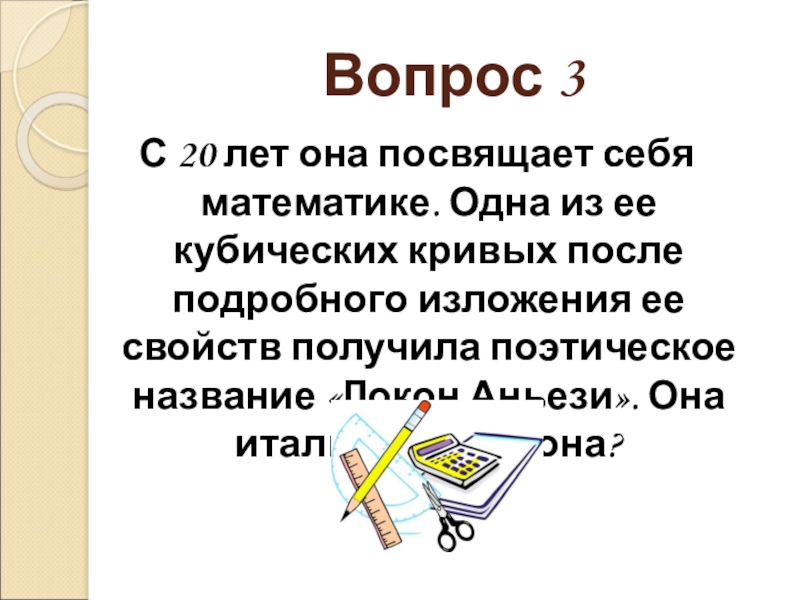 кубических кривых после подробного изложения ее свойств получила поэтическое название «Локон Аньези». Она итальянка. Кто она?