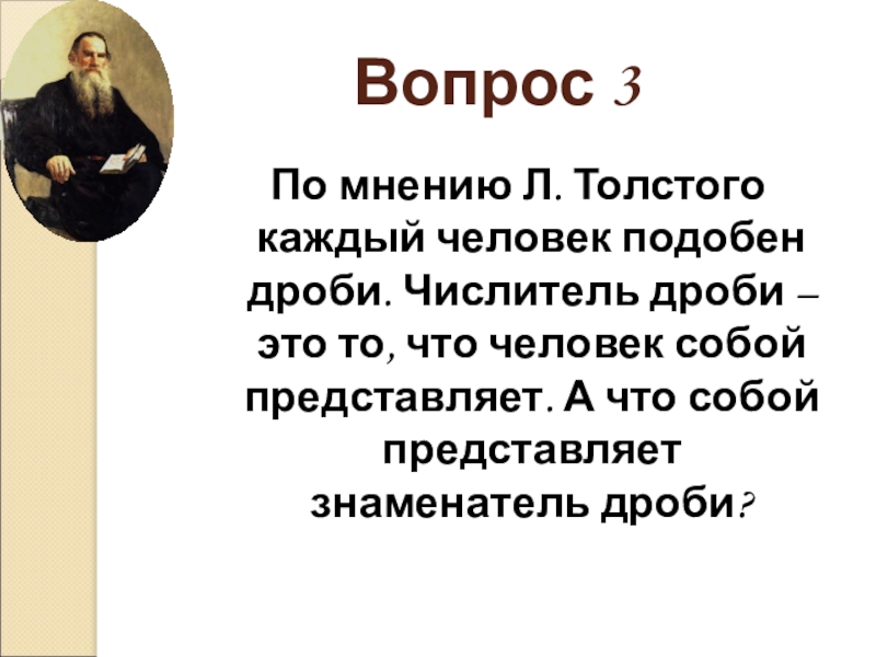 Вопрос 3 По мнению Л. Толстого каждый человек подобен дроби. Числитель дроби – это то, что человек