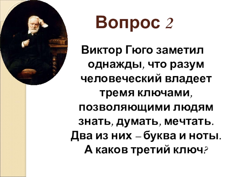 Вопрос 2Виктор Гюго заметил однажды, что разум человеческий владеет тремя ключами, позволяющими людям знать, думать, мечтать. Два