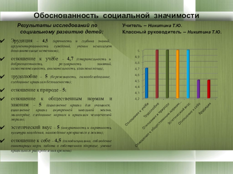 отношение к учёбе – 4,7 (старательность и добросовестность, регулярность занятий, самостоятельность, внимательность, взаимопомощь);