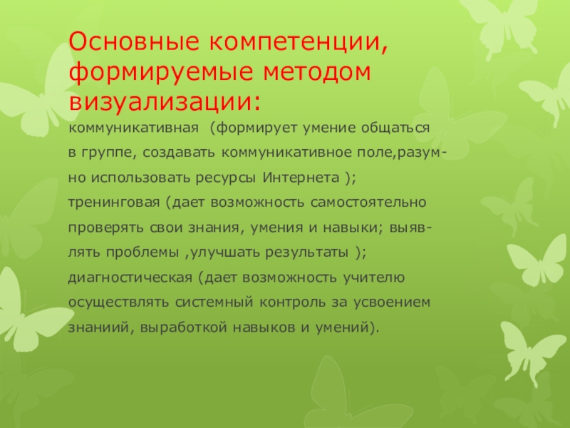 Слайд 3Основные компетенции, формируемые методом визуализации: