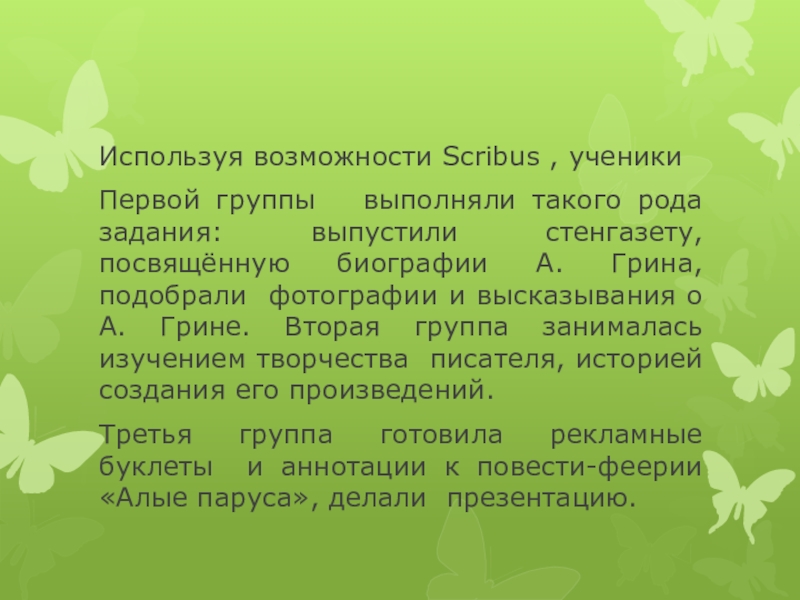 задания: выпустили стенгазету, посвящённую биографии А. Грина, подобрали фотографии и высказывания о А. Грине. Вторая группа занималась изучением творчества писателя, историей создания его произведений.