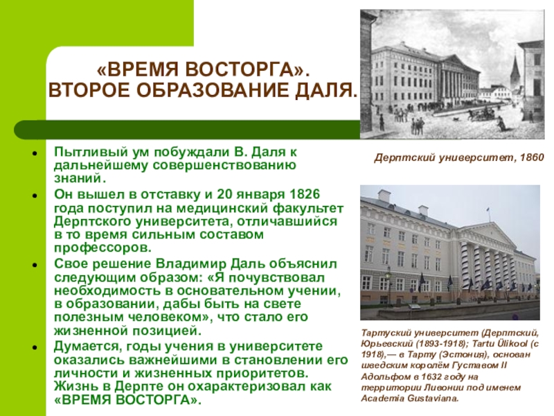Думается, годы учения в университете оказались важнейшими в становлении его личности и жизненных приоритетов. Жизнь в Дерпте он охарактеризовал как «ВРЕМЯ ВОСТОРГА».