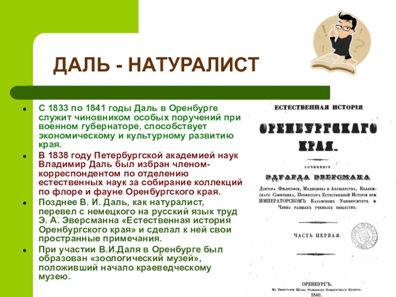 Позднее В. И. Даль, как натуралист, перевел с немецкого на русский язык труд Э. А. Эверсманна «Естественная история Оренбургского края» и сделал к ней свои пространные примечания.