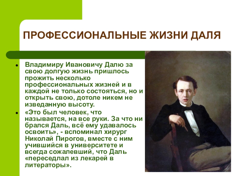 «Это был человек, что называется, на все руки. За что ни брался Даль, всё ему удавалось освоить», - вспоминал хирург Николай Пирогов, вместе с ним учившийся в университете и всегда сожалевший, что Даль «переседлал из лекарей в литераторы».
