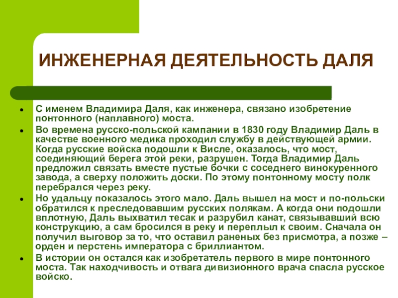 Во времена русско-польской кампании в 1830 году Владимир Даль в качестве военного медика проходил службу в действующей армии. Когда русские войска подошли к Висле, оказалось, что мост, соединяющий берега этой реки, разрушен. Тогда Владимир Даль предложил связать вместе пустые бочки с соседнего винокуренного завода, а сверху положить доски. По этому понтонному мосту полк перебрался через реку.