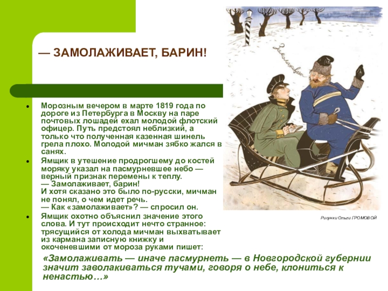 Ямщик в утешение продрогшему до костей моряку указал на пасмурневшее небо — верный признак перемены к теплу.