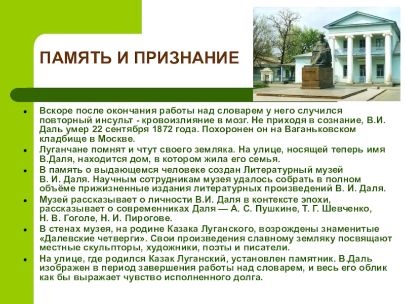 - кровоизлияние в мозг. Не приходя в сознание, В.И. Даль умер 22 сентября 1872 года. Похоронен он на Ваганьковском кладбище в Москве.