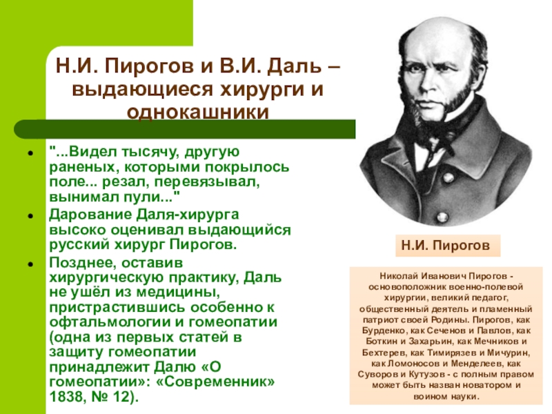Слайд 11Н.И. Пирогов и В.И. Даль – выдающиеся хирурги и однокашники