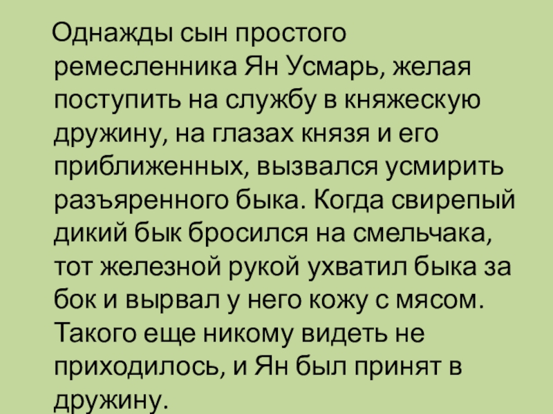 службу в княжескую дружину, на глазах князя и его приближенных, вызвался усмирить разъяренного быка. Когда свирепый дикий бык бросился на смельчака, тот железной рукой ухватил быка за бок и вырвал у него кожу с мясом. Такого еще никому видеть не приходилось, и Ян был принят в дружину.