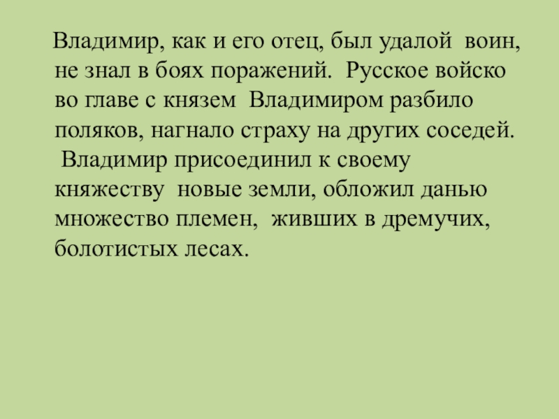 Владимир присоединил к своему княжеству новые земли, обложил данью множество племен, живших в дремучих, болотистых лесах.