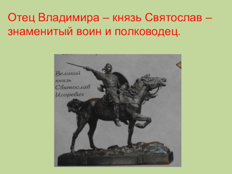 Слайд 5Отец Владимира – князь Святослав – знаменитый воин и полководец.