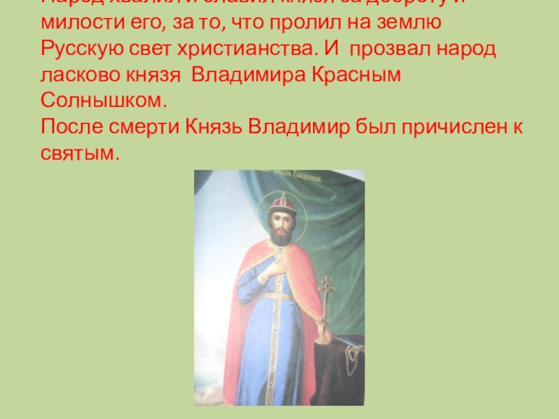 то, что пролил на землю Русскую свет христианства. И прозвал народ ласково князя Владимира Красным Солнышком.