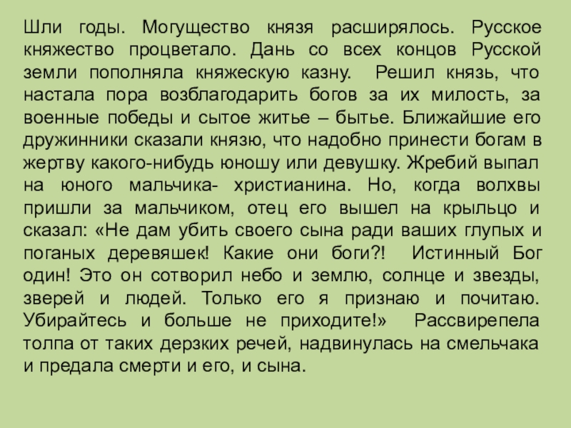 концов Русской земли пополняла княжескую казну. Решил князь, что настала пора возблагодарить богов за их милость, за военные победы и сытое житье – бытье. Ближайшие его дружинники сказали князю, что надобно принести богам в жертву какого-нибудь юношу или девушку. Жребий выпал на юного мальчика- христианина. Но, когда волхвы пришли за мальчиком, отец его вышел на крыльцо и сказал: «Не дам убить своего сына ради ваших глупых и поганых деревяшек! Какие они боги?! Истинный Бог один! Это он сотворил небо и землю, солнце и звезды, зверей и людей. Только его я признаю и почитаю. Убирайтесь и больше не приходите!» Рассвирепела толпа от таких дерзких речей, надвинулась на смельчака и предала смерти и его, и сына.