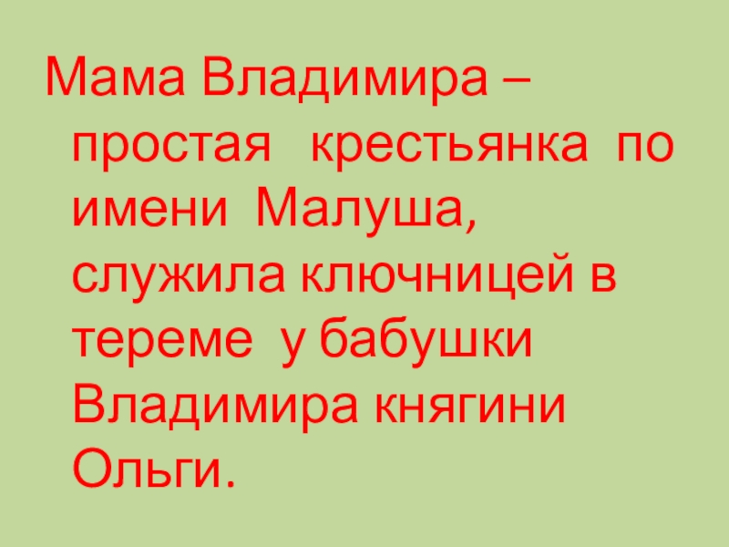 Мама Владимира –простая крестьянка по имени Малуша, служила ключницей в