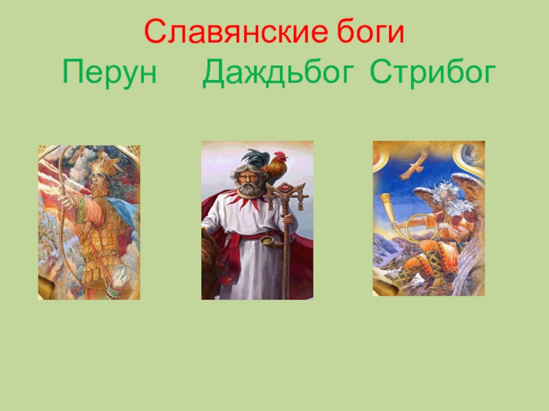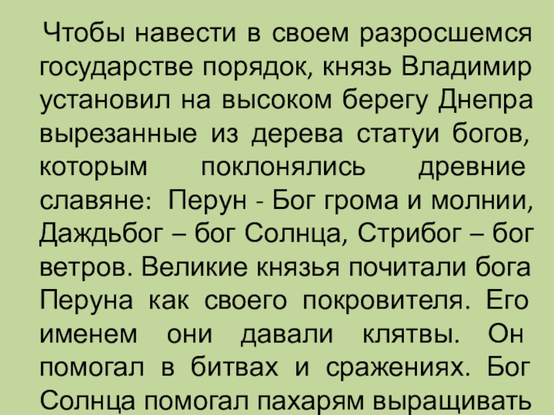 установил на высоком берегу Днепра вырезанные из дерева статуи богов, которым поклонялись древние славяне: Перун - Бог грома и молнии, Даждьбог – бог Солнца, Стрибог – бог ветров. Великие князья почитали бога Перуна как своего покровителя. Его именем они давали клятвы. Он помогал в битвах и сражениях. Бог Солнца помогал пахарям выращивать и собирать урожай.