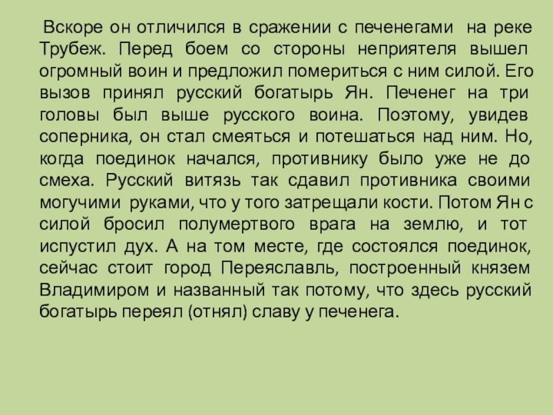 Трубеж. Перед боем со стороны неприятеля вышел огромный воин и предложил помериться с ним силой. Его вызов принял русский богатырь Ян. Печенег на три головы был выше русского воина. Поэтому, увидев соперника, он стал смеяться и потешаться над ним. Но, когда поединок начался, противнику было уже не до смеха. Русский витязь так сдавил противника своими могучими руками, что у того затрещали кости. Потом Ян с силой бросил полумертвого врага на землю, и тот испустил дух. А на том месте, где состоялся поединок, сейчас стоит город Переяславль, построенный князем Владимиром и названный так потому, что здесь русский богатырь переял (отнял) славу у печенега.