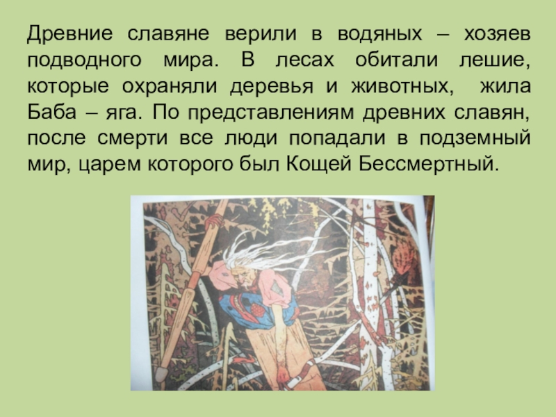 обитали лешие, которые охраняли деревья и животных, жила Баба – яга. По представлениям древних славян, после смерти все люди попадали в подземный мир, царем которого был Кощей Бессмертный.