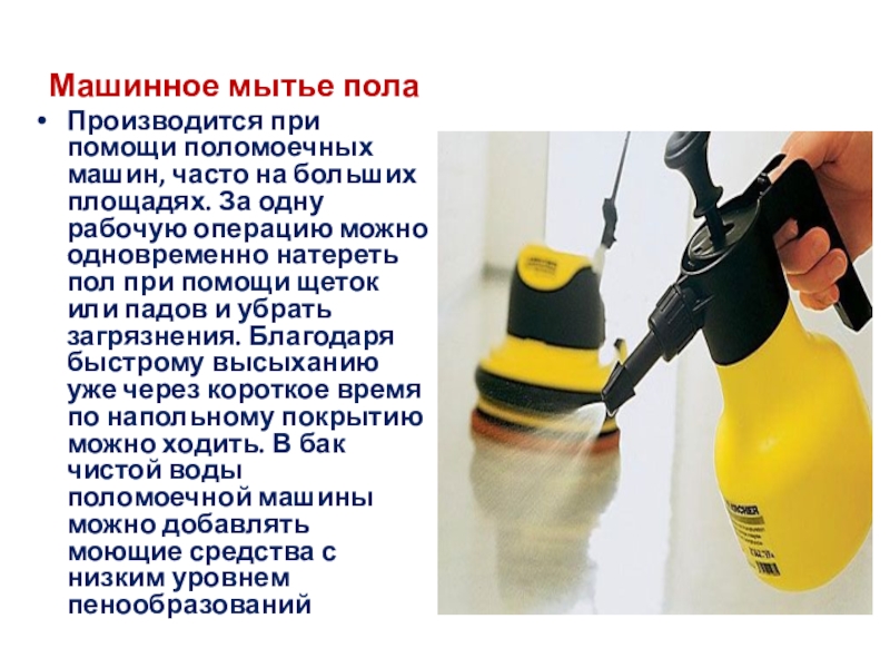 площадях. За одну рабочую операцию можно одновременно натереть пол при помощи щеток или падов и убрать загрязнения. Благодаря быстрому высыханию уже через короткое время по напольному покрытию можно ходить. В бак чистой воды поломоечной машины можно добавлять моющие средства с низким уровнем пенообразований
