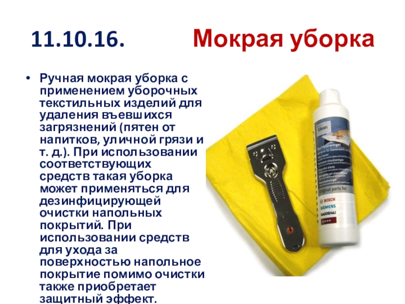 применением уборочных текстильных изделий для удаления въевшихся загрязнений (пятен от напитков, уличной грязи и т. д.). При использовании соответствующих средств такая уборка может применяться для дезинфицирующей очистки напольных покрытий. При использовании средств для ухода за поверхностью напольное покрытие помимо очистки также приобретает защитный эффект.