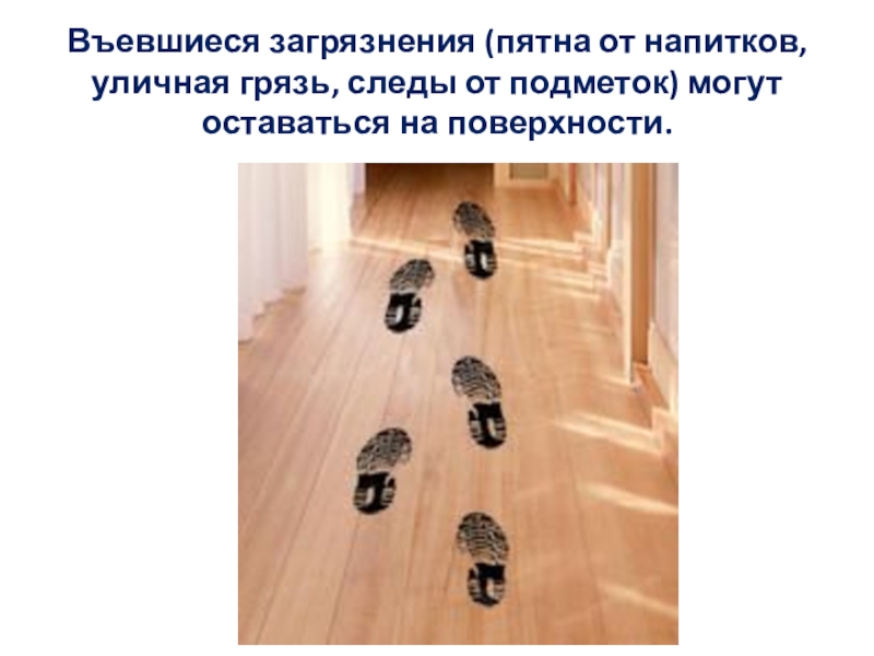 Слайд 7Въевшиеся загрязнения (пятна от напитков, уличная грязь, следы от подметок) могут