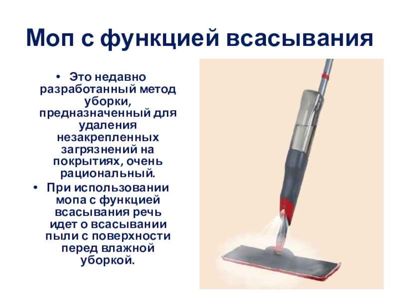 При использовании мопа с функцией всасывания речь идет о всасывании пыли с поверхности перед влажной уборкой.