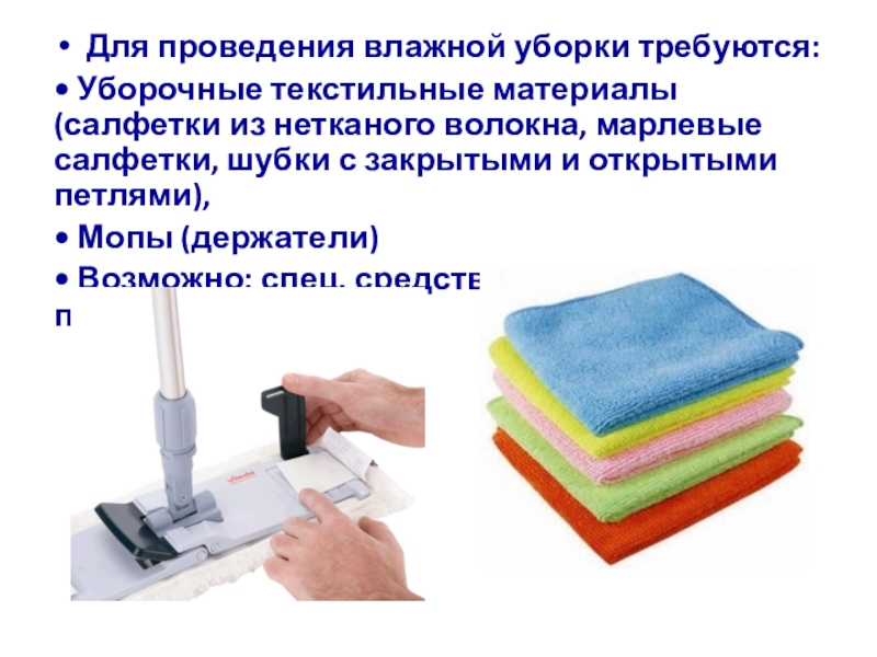 поверхностью загрязнений и осуществляется ручным инвентарем с применением увлажненных текстильных материалов и изделий мопы, тряпки, салфетки