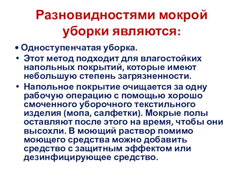 Такой вид уборки представляет собой классическую мокрую уборку. В течение