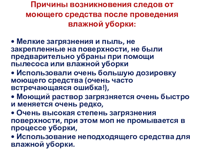 Слайд 19Причины возникновения следов от моющего средства после проведения влажной уборки: