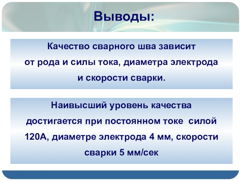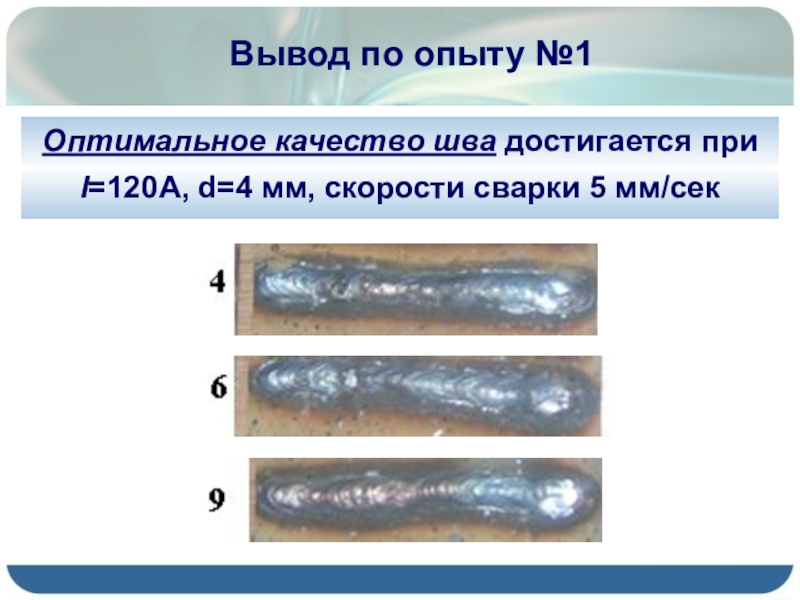 достигается при постоянном токе силой 120А, диаметре электрода 4 мм, скорости сварки 5 мм/сек